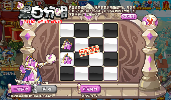 紫玉长老作为本次核心奖励宠物,虽外形质朴但拥有超规格种族数值,建议所有玩家优先获取。活动场景设置黑白双色棋盘,两位长老分别驻守不同区域,需通过战略部署完成区域净化。
