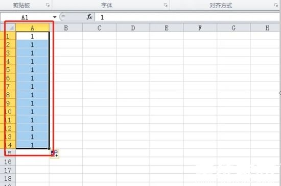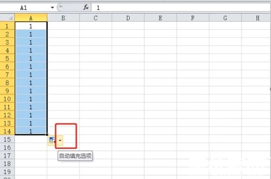 2、常规操作时将光标移至单元格右下角,出现黑色十字标记时执行拖拽动作,此时发现填充区域数值未发生预期变化;